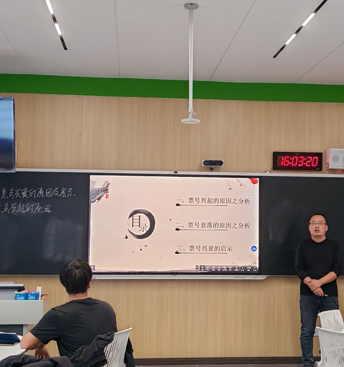 课程尾声,张亚杰老师寄语学生:以铜为鉴,可正衣冠;以史为鉴,可知兴替。研究票号兴衰,旨在为今人提供三方面启示:居安思危、勇于创新;善于学习、避免自大;兼听则明、偏信则暗。