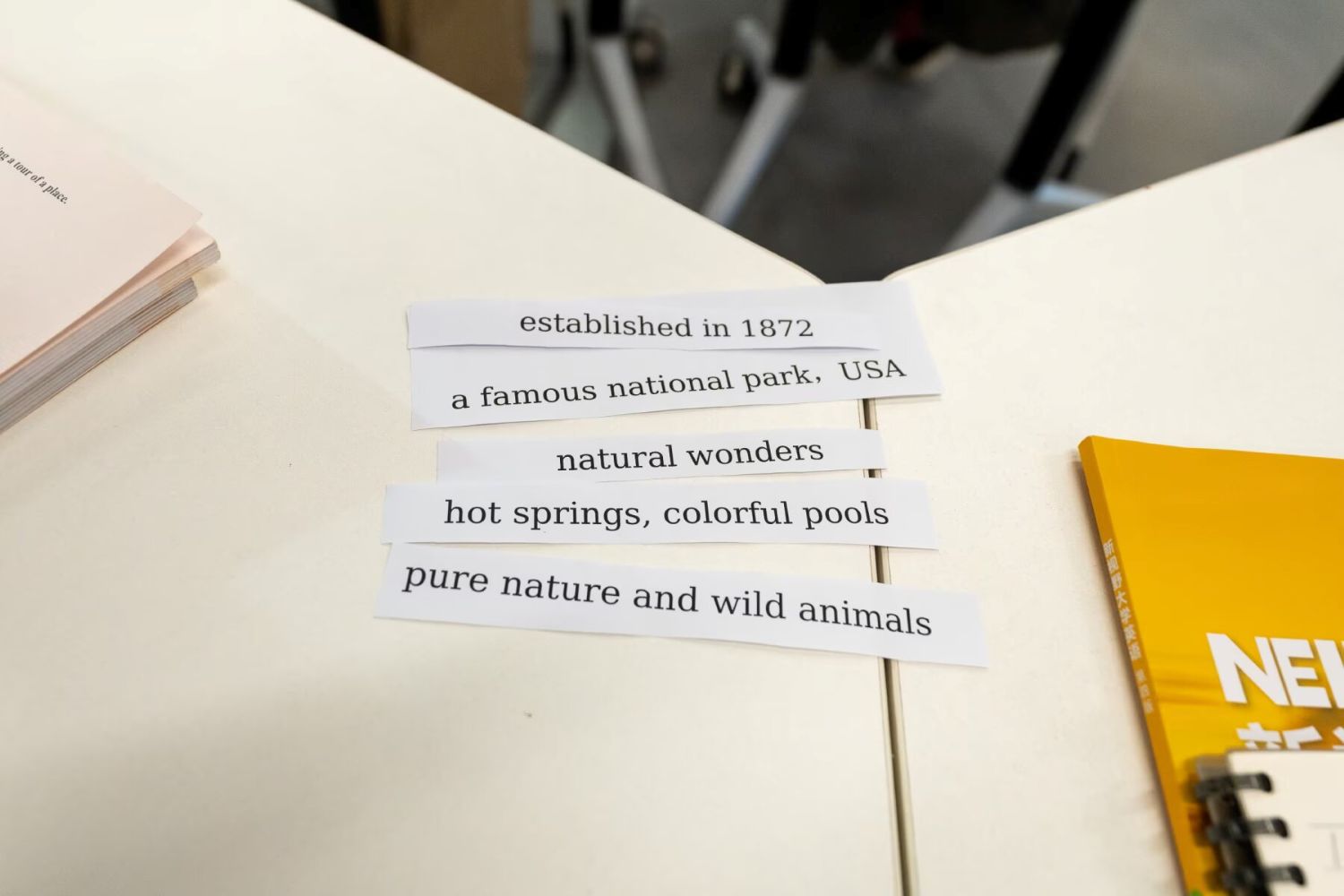 在小组协作环节,学生以5–6人分组,通过拆解“线索信封”猜测景点,并合作完成“跨文化关联工作表”。任务要求学生在识别景点基本信息的基础上,对比中外文化的异同,并使用英文完成表达输出。过程中,中方教师协助学生理解文化背景,外教则巡回指导语言表达,双师协同确保每位学生都能参与其中。