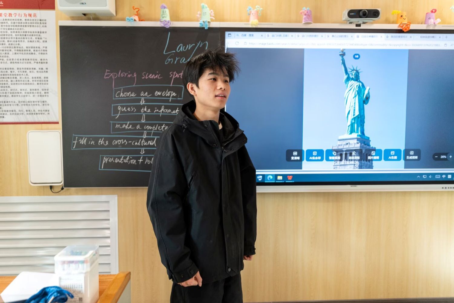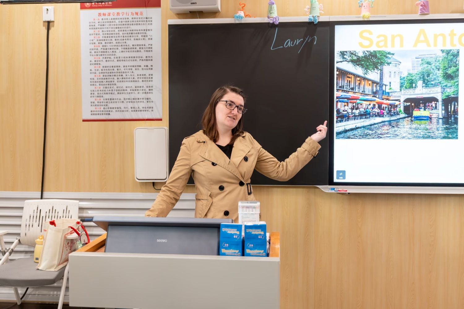 活动围绕“探索中美知名景点”展开,外教Lauryn首先以本土视角分享了美国的地质与人文景观,并结合自身游览经历讲述了她前往中国西安时感受到独特中华文化的魅力。生动的讲述激发了学生的兴趣,也为后续任务奠定了语境基础。