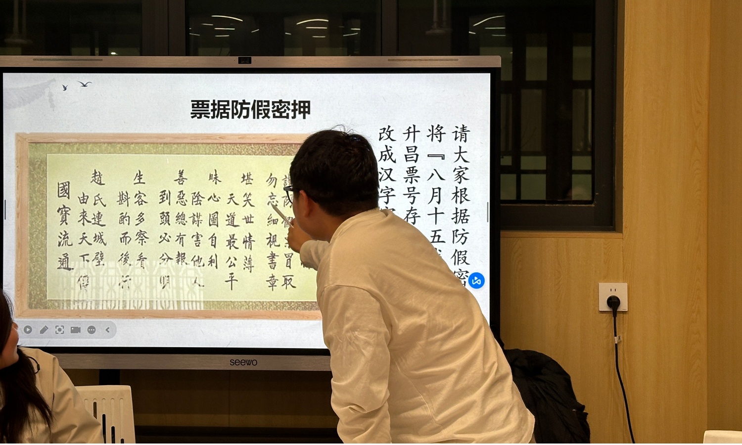 在张亚杰老师的巧妙引导下,102教室悄然变身为一座微型晋商票号。学生们手持仿制票据,执笔落墨、蘸印盖章,在角色扮演的互动对话中,完整亲历了百年前金融票据从出票、背书记载到最终兑付的全流程。这堂课打破传统课堂的单向讲授模式,以“实物触摸+情景沉浸+思政融入”的三位一体设计,让沉淀于岁月中的晋商智慧与诚信精神,在当代大学课堂上翩然苏醒。