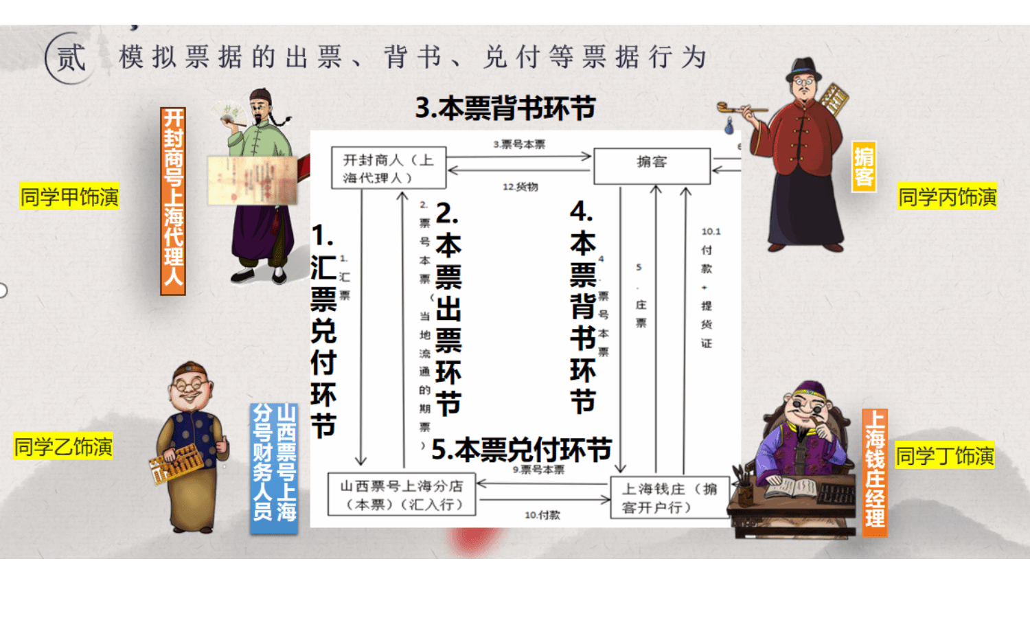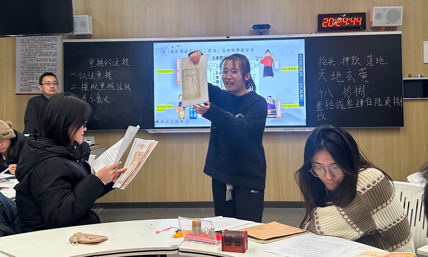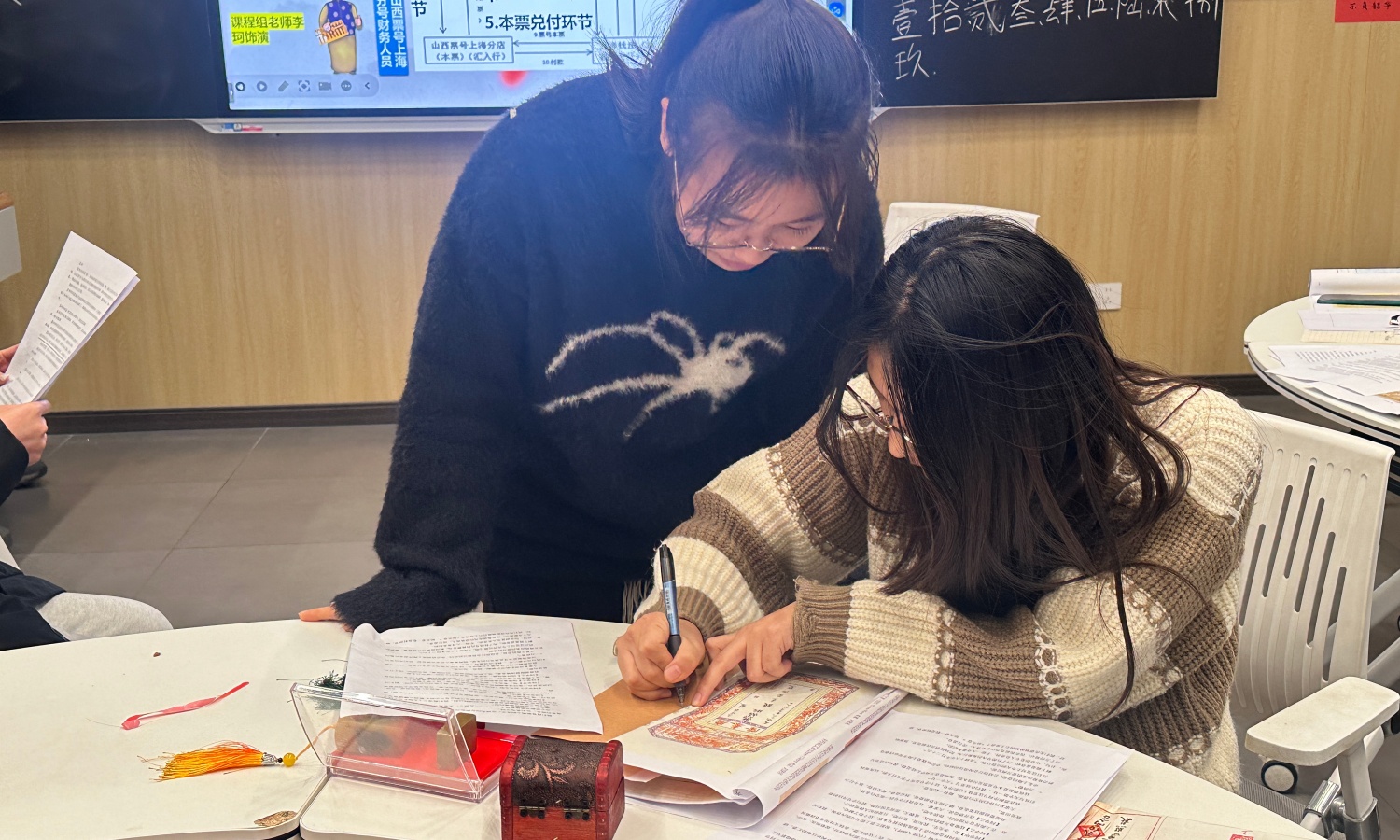 “掌柜,烦请兑付这张汇票!”“核验无误,即刻为您办理!”随着一声声鲜活的对话,课堂氛围推向高潮。在情景模拟环节,学生们分组化身商人、票号掌柜、钱庄经理等角色,完整演绎了汇票兑付、本票签发、背书转让、庄票兑换等核心流程。抽象的金融制度在真实的互动中变得可感可触,学生们清晰领悟到,百年前的金融网络正是依靠“票”的规范与“信”的支撑,才得以在城市间高效流转、汇通天下。