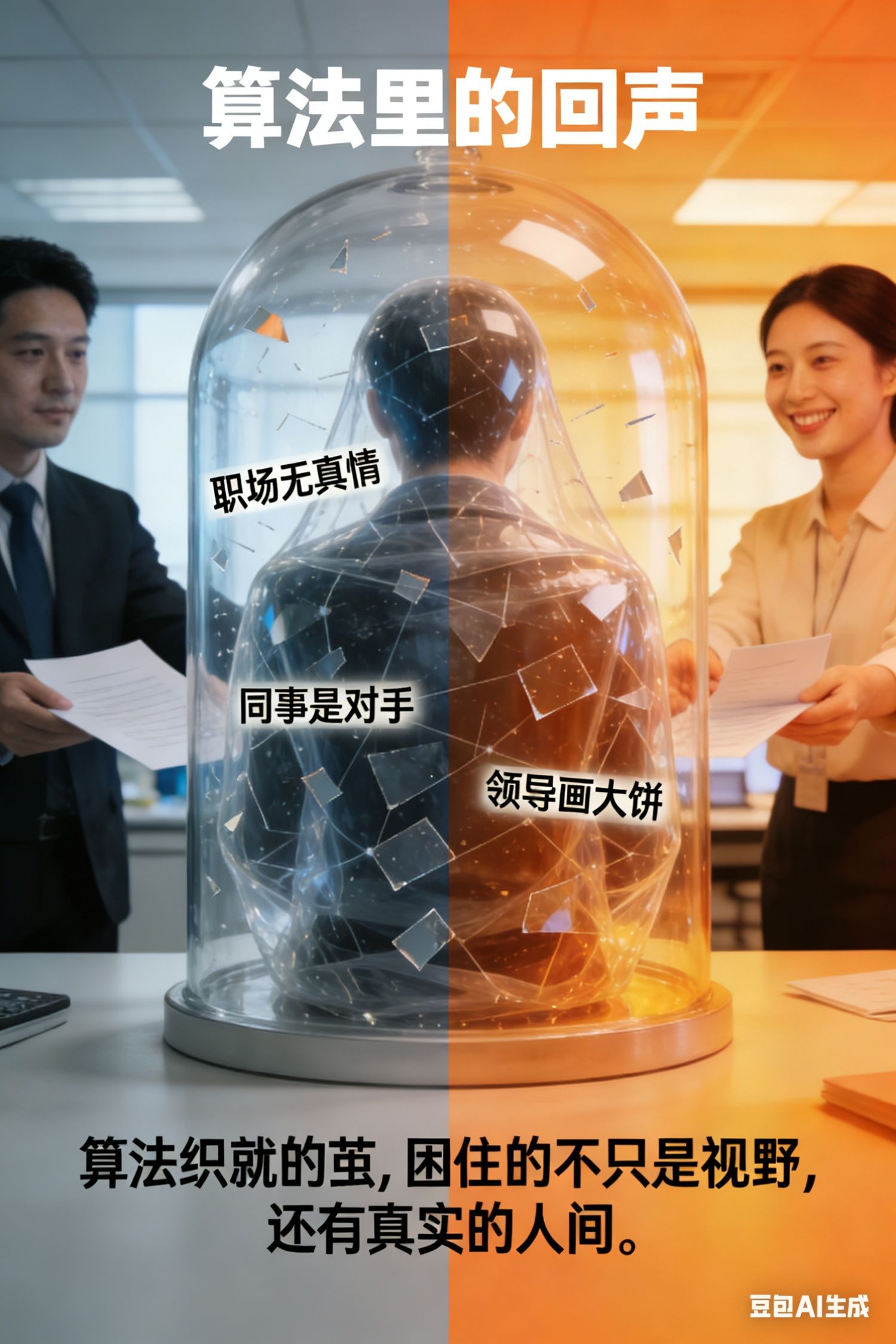 王佳祺同学的作品《算法回声:职场新人的信息茧房》,通过一位职场新人的故事,细腻展现了算法推荐如何加固固有认知、塑造偏狭的“媒介现实”。海报用回声状的网络结构与孤立的个体形象,传递出疏离与反思之意,并在最终呼吁以积极心态主动突破茧房,保持思维开放。