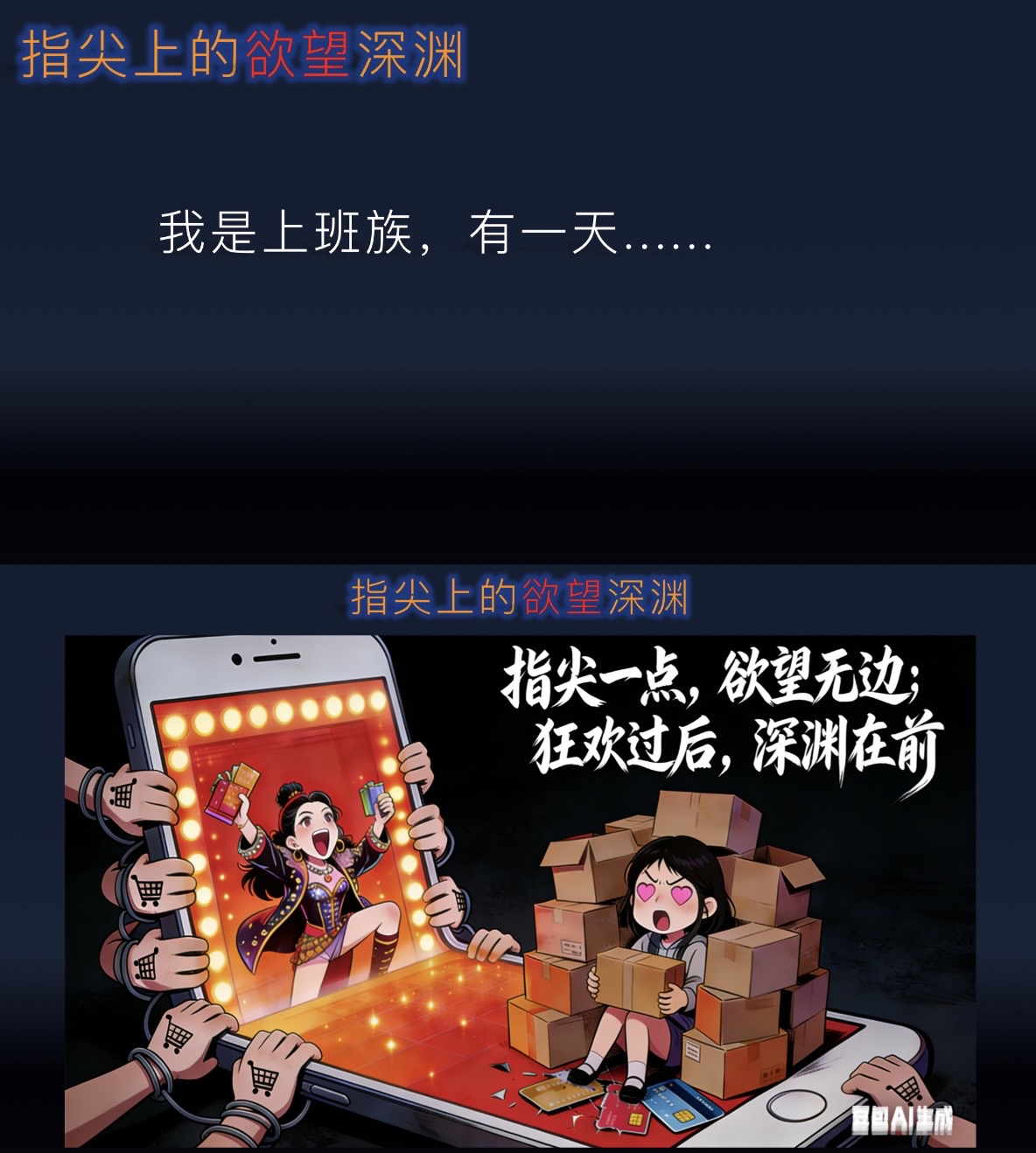 围绕拟态环境、媒介依存、消费异化、认知极化、符号消费五大核心主题之一,进行叙事创作,AI视觉转化和综合呈现。故事创作要求主角经历媒介技术引发的认知或行为突变,并有机嵌入至少两个大众传播理论,最终以戏剧性反转呈现虚拟与现实的碰撞。