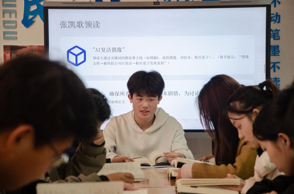 接着,由张凯歌同学作为领读人,介绍了故事中涉及的博嗣X、粉丝爱子、维贝兹科技公司等角色,串联起“偶像去世→被科技公司AI复活→粉丝爱子发现真相”的故事主线。帮助大家回顾了剧情,为后续深入讨论打好基础。程老师以张凯歌领读的书中故事为参考,将话题延申到同学们,程老师提问,“如果你喜欢的人或偶像有机会被AI‘复活’,你会复活谁?”这个问题迅速引发了同学们的思考与讨论。有同学表示希望复活自己已故亲人,渴望有更多机会与他相处;有同学想复活毛泽东,希望亲自表达对他的崇敬,并请教他治军之道和治国方略;还有同学提出想复活袁隆平、李白、马克思、科比·布莱恩特等不同领域的杰出人物。这一环节揭示了同学们对历史人物、亲人和文化偶像的复杂情感,也引出了对AI“复活”技术深层次的思考。