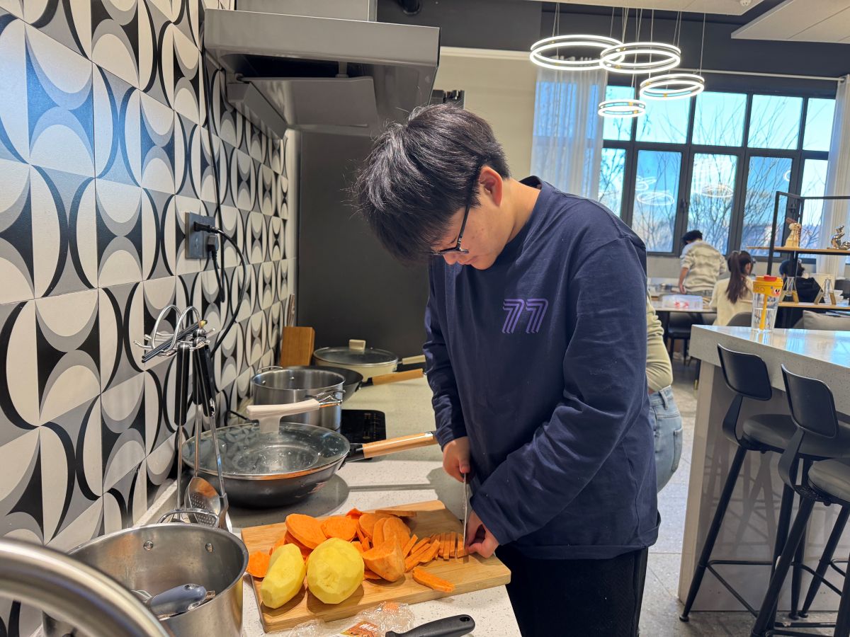 当暮色给上河的楼宇镀上一层温柔的金边,共享厨房的玻璃门内,早已升腾起烟火气与欢声笑语。吴晛莉导师组大一到大四的同学们在厨房中穿梭忙碌,这场烤肉之约,早已超越了美食的范畴,成了一段温暖的青春纪事。