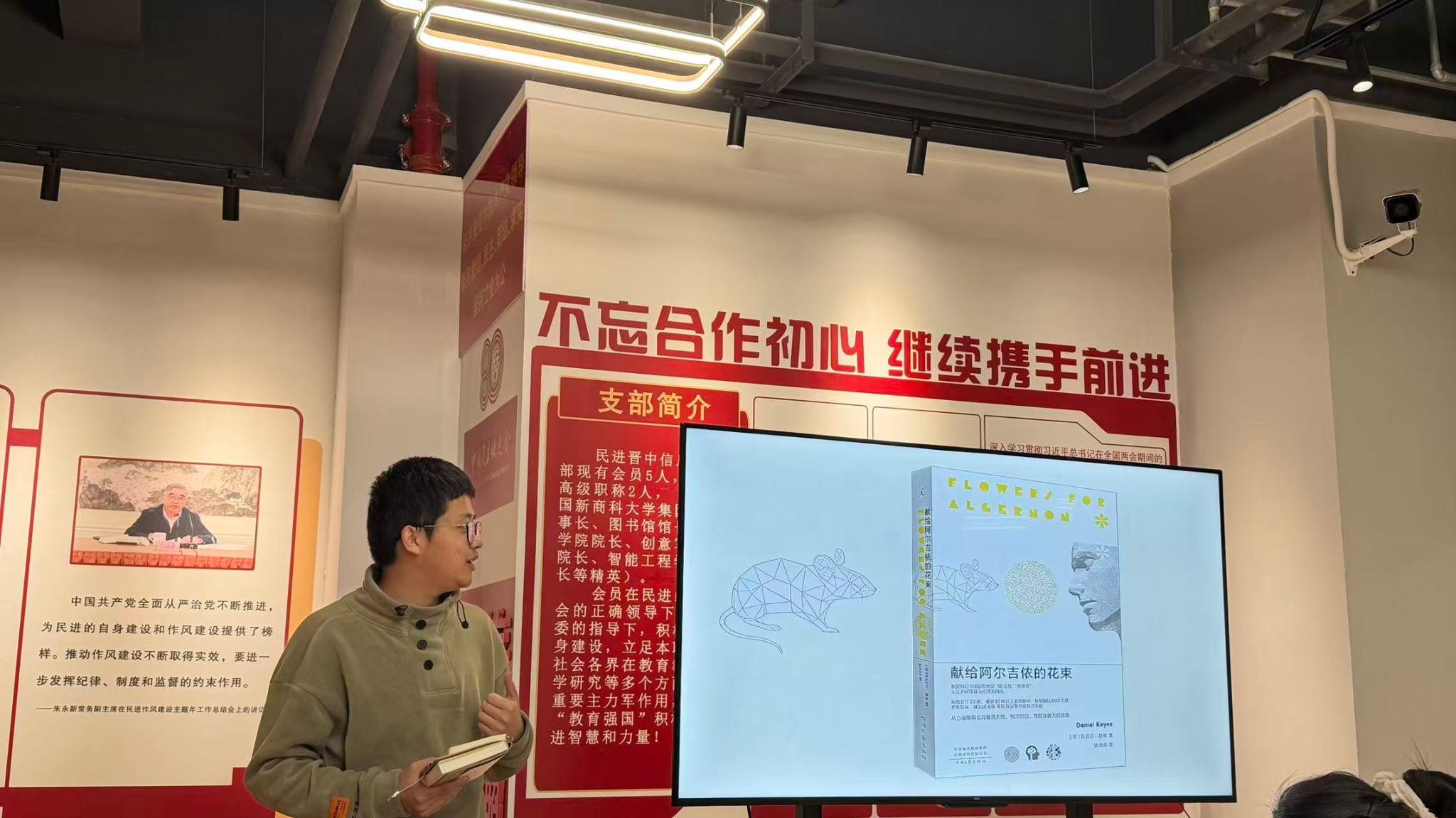 接着由葛思通同学为了我们分享了《献给阿尔吉侬的花束》这本书,它讲述了以智力障碍者查理·戈登,在接受脑部手术实现智力飞跃后,却又不得不面对智识急速衰退的悲剧性历程。葛思通在分享的最后提出了自己对这本书的深刻见解,他认为《献给阿尔吉侬的花束》绝非一个智力障碍者跃升天才又黯然陨落的悲剧叙事,而是一个善良的人在智识的跌宕里,始终坚守着人性底色的生命史诗。最后,他呼吁大家一起携手关注社会弱势群体,为每一个平凡又珍贵的生命撑起被看见、被善待的天空。