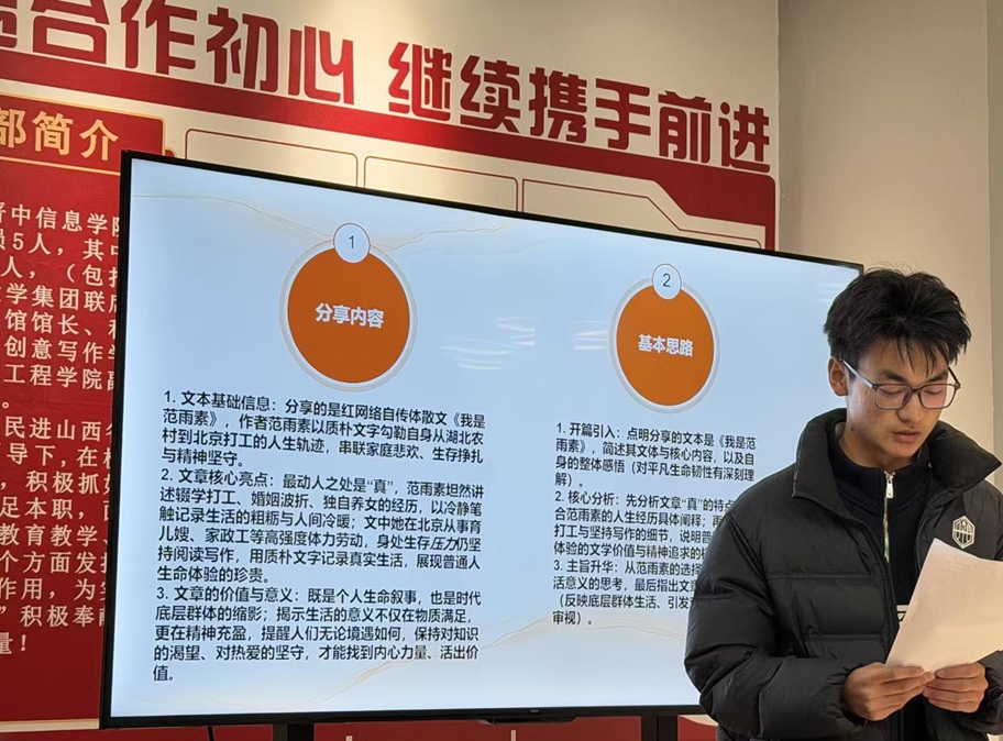 郝晨宇同学首先为大家带来了一篇网络自传体散文《我是范雨素》,这是一部非虚构文学作品。郝同学分享了文中主人公——范雨素,一个社会底层人民,却拥有百折不挠、坚毅顽强的美好品质。揭示了这篇文章的社会价值与意义:既是个体生命叙事,也是时代底层群众的缩影。最后,引申出同学们对生活意义的思考,得以让我们在追问“如何爱生命”时得到深刻启示:真正的生命之爱,是直面苦难仍不放弃生长,是于平凡甚至窘迫的生活里,牢牢握住属于自己的精神灯塔。
