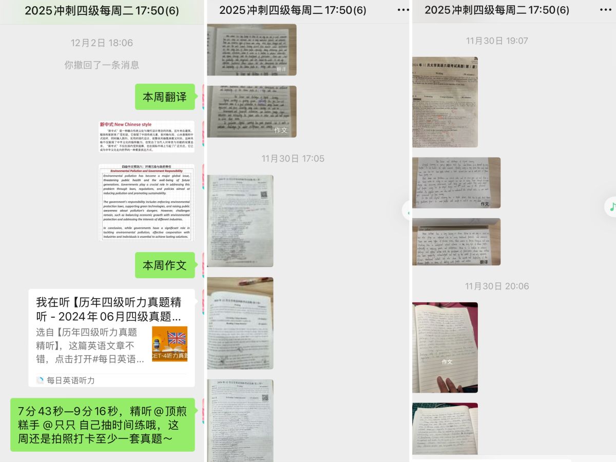 每周的翻译和作文练习,成为连接两次见面的桥梁。我把题目发到微信群,他们陆续交回自己的作业——有时是深夜图书馆的照片,有时是布满修改痕迹的稿纸。最让我动容的不是语言的进步,而是这种无声的陪伴感。每个人都知道,在相同的夜晚,有另外几个人也在为同一件事努力。