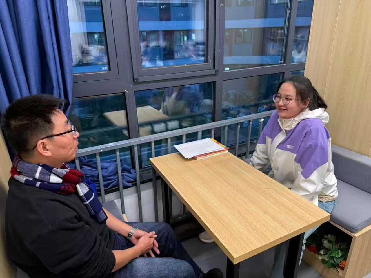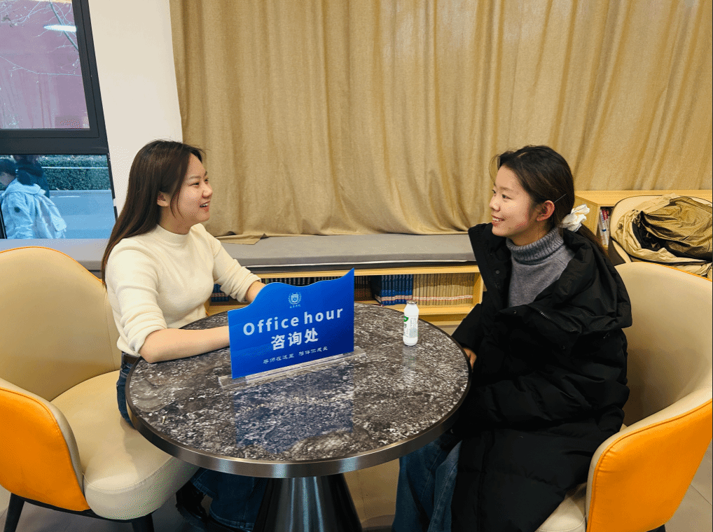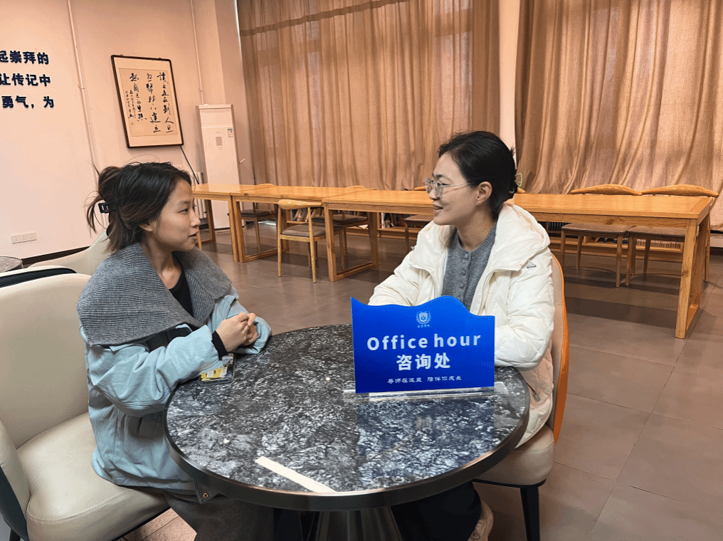 在成长与心灵关怀上,扮演“陪伴者”与“守护者”。Office Hour最温暖的意义,在于它提供了一个安全的心灵港湾。赵晨倩老师将四六级辅导与谈心谈话巧妙结合,在关注成绩的同时更关心学生的压力与情绪。特别是在赵若男、郝崇伶老师休产假期间,杨晓玲、王哲仁老师无缝衔接的承接,确保了学生“不被中断的关怀”。这种持续的陪伴感,让学生敢于流露困惑与脆弱。正如一位学生所言:“知道每周都有一个固定时间可以找到老师,说说学习,也聊聊生活,这种感觉很踏实,让我觉得在这个大校园里不是独自一人。”