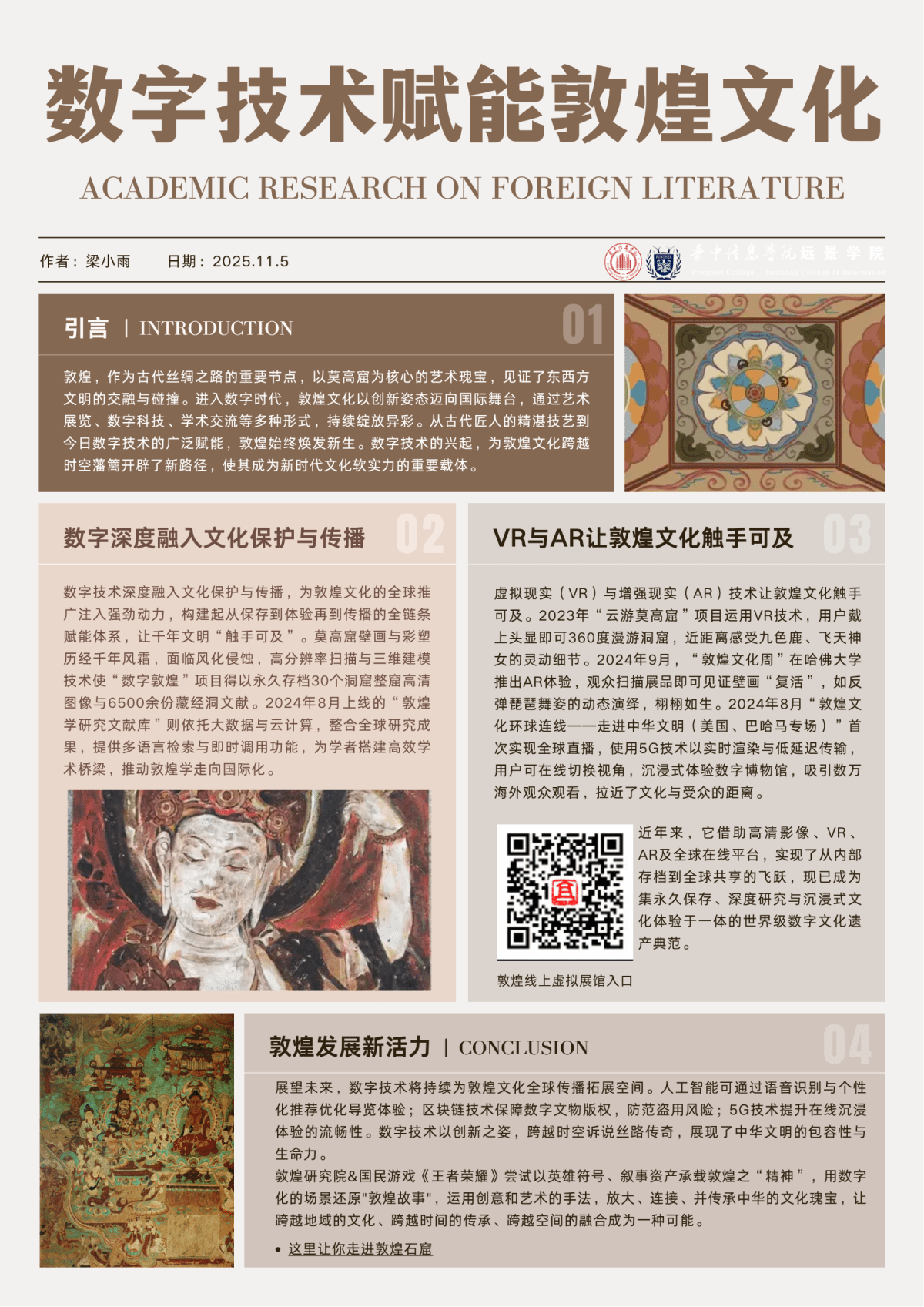 作品点评:作品精准锚定数字经济对文化产业的赋能逻辑,从保护(高清扫描、三维建模)、传播(VR/AR、全球平台)到活化(游戏联名),完整覆盖敦煌文化数字化的全链条。既用 “30 个洞窟高清图像”“6500 余经卷” 等数据体现技术落地的实操性,也通过 “云游莫高窟”“全球连线” 等案例展现传播效能,最后延伸 AI、区块链等技术的未来价值,思考有深度、有层次。整体是一份兼具学术性与实践洞察的优质作业。
