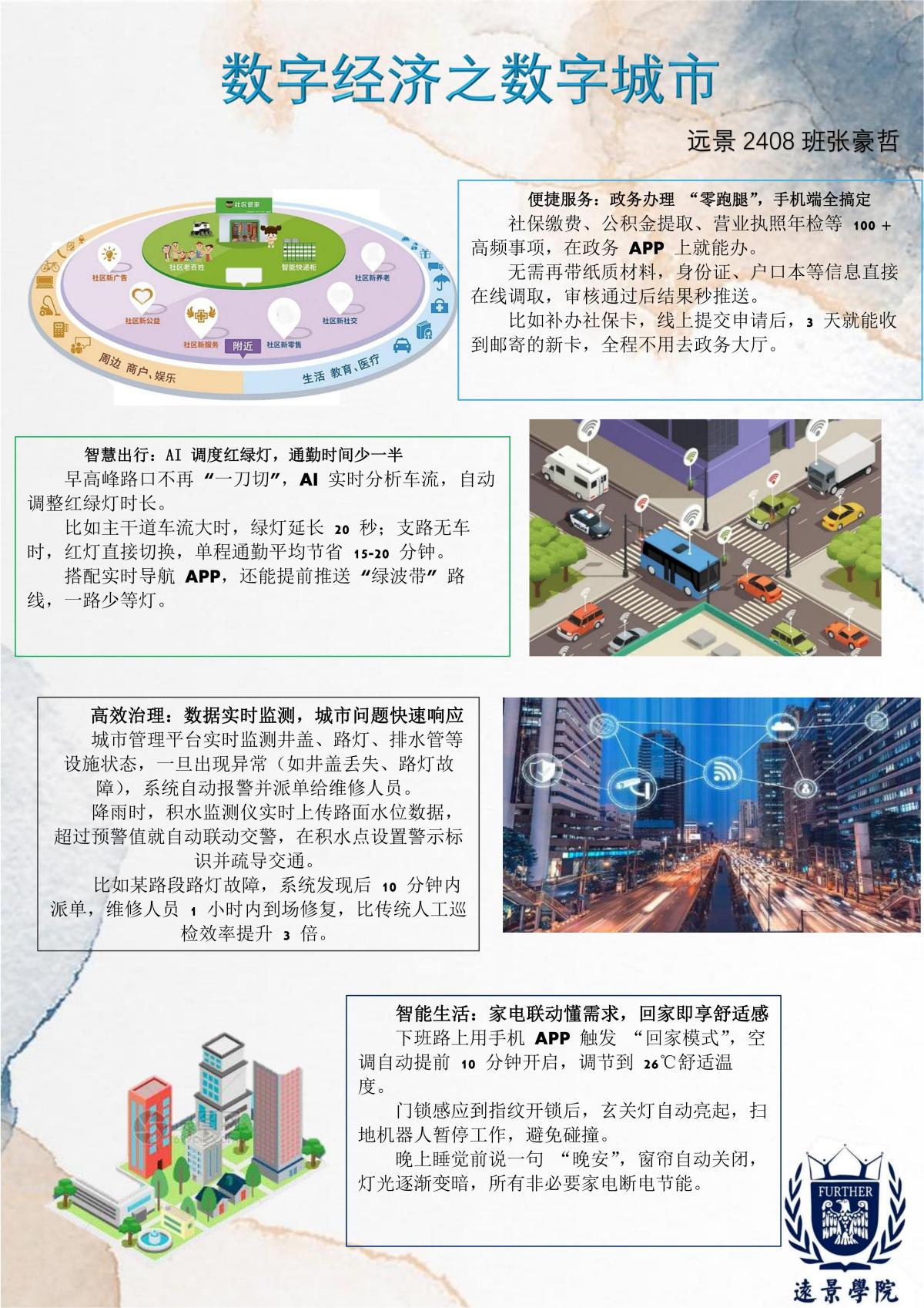 作品点评:作品以数字城市为主题,从智慧出行、便捷服务、高效治理、智能生活四大场景切入,案例具体生动,如 AI 调度红绿灯、政务 “零跑腿” 等,直观展现了数字技术对城市生活的全方位优化。每个场景均搭配实际应用效果描述,让数字赋能的价值一目了然。结构清晰、重点突出,聚焦城市治理与民生服务的核心需求,体现了对数字城市建设的深刻理解。作品贴近生活、逻辑连贯,整体展现了较强的场景化拆解与实践观察能力。
