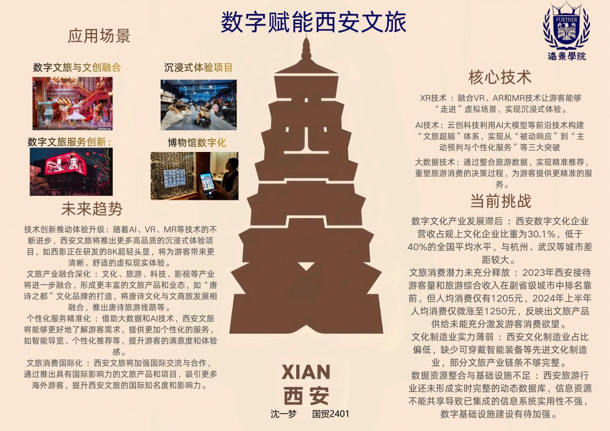 作品点评:作品聚焦西安文旅数字化转型,核心技术明确,围绕 XR、AI、大数据三大技术展开,结合沉浸式体验、博物馆数字化等应用场景,精准呈现技术赋能方向。同时直面数字文化产业滞后、消费潜力未释放等本地特色挑战,未来趋势预判贴合西安文旅资源禀赋,兼具针对性与前瞻性。案例具体、数据详实,展现了对地域文旅产业的深度了解与数字经济的融合思考。结构上从技术到挑战再到趋势,层层递进,逻辑清晰。整体是一份兼具地域特色与行业深度的优秀作品。