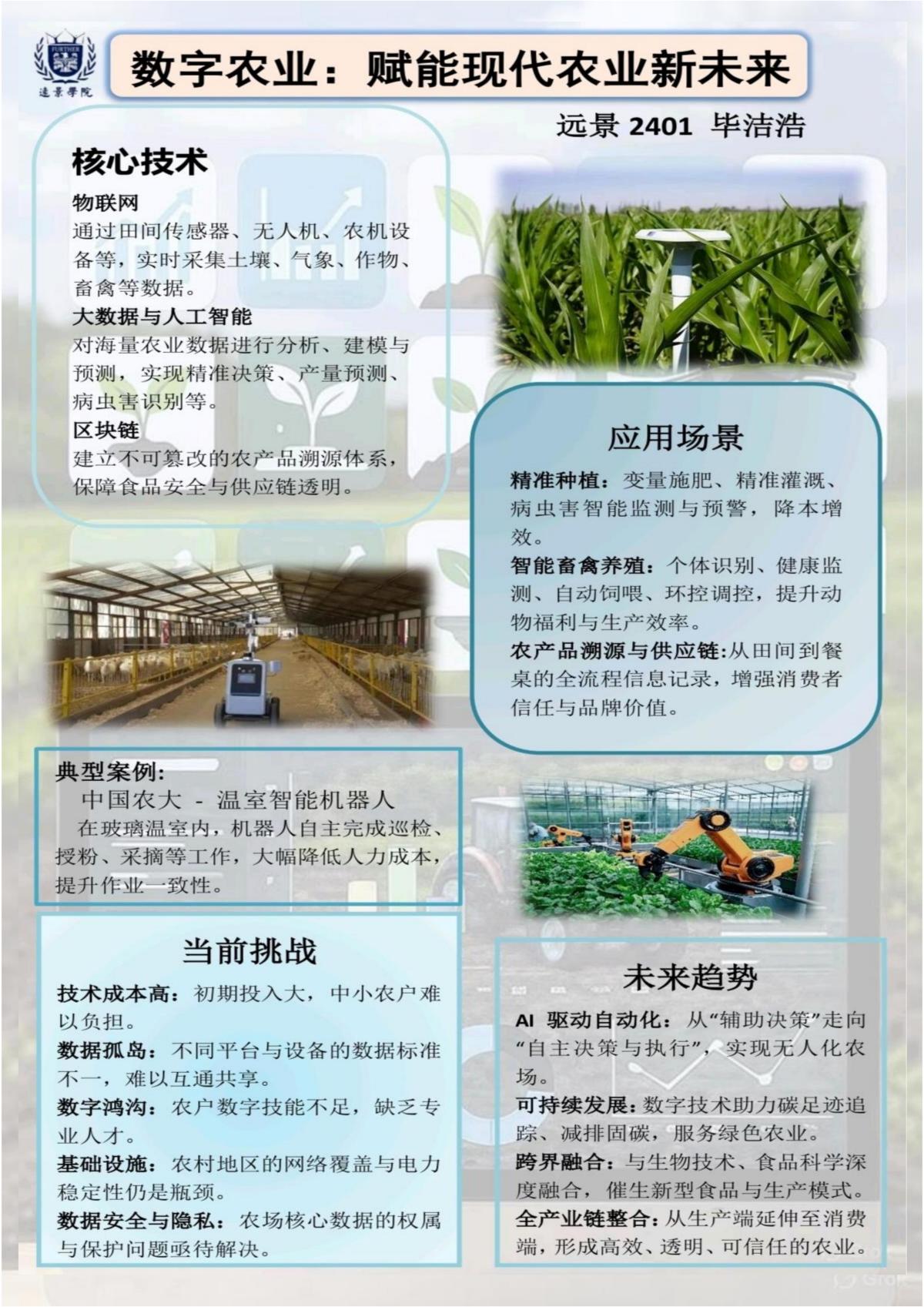 作品点评:作品系统梳理了物联网、大数据、区块链三大核心技术,结合精准种植、智能养殖、农产品溯源等多元应用场景,完整呈现数字技术对农业的全链条赋能。同时直面技术成本、数据孤岛、数字鸿沟等现实挑战,思考全面且贴合农业实际。结构清晰、重点突出,既展现了数字农业的技术逻辑,也关注到落地过程中的现实阻碍,体现了对农业数字化转型的深入思考。若能补充具体案例及数据,进一步说明技术应用的实际成效,将让海报更具说服力,整体表现亮眼。