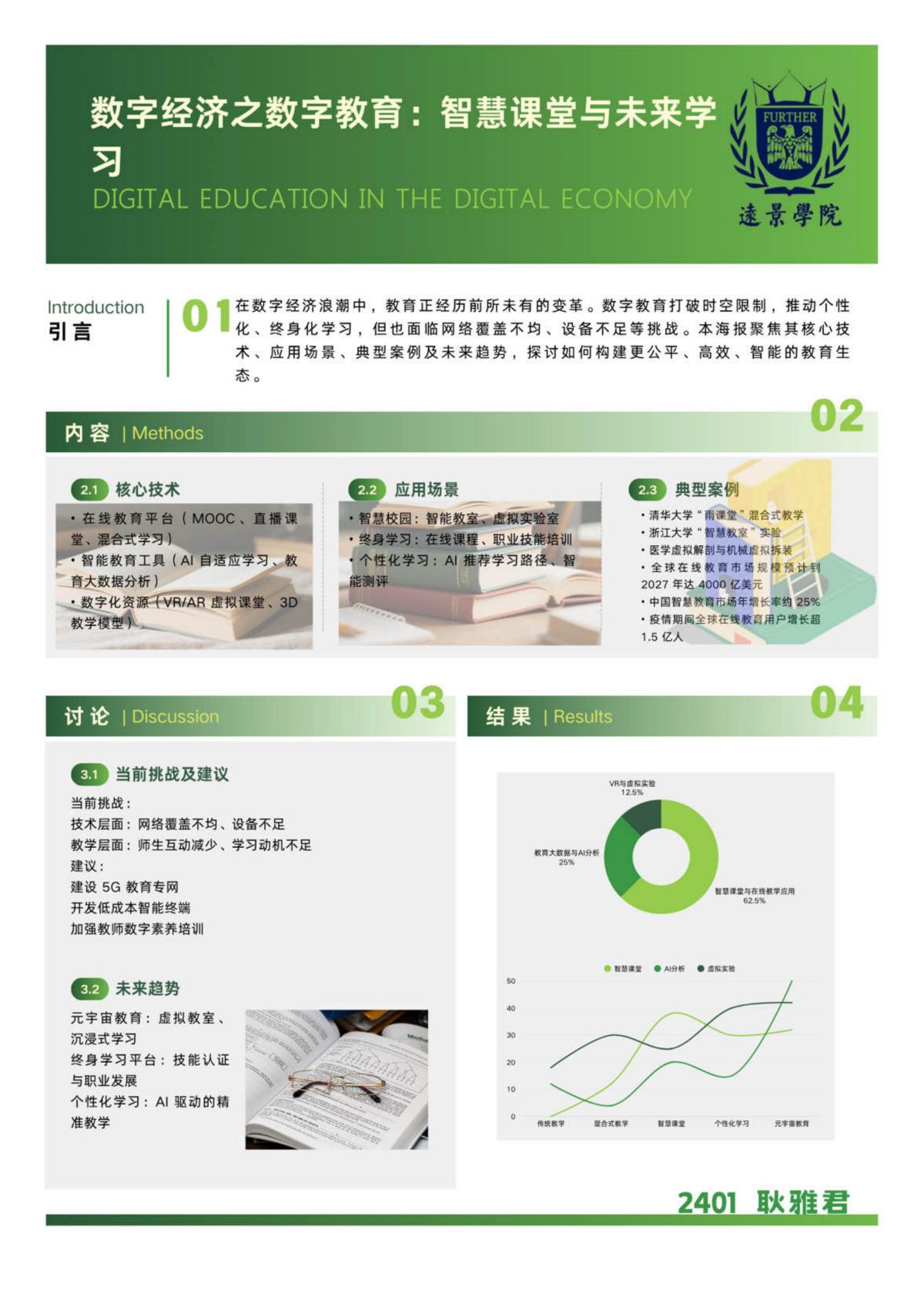 作品点评:作品围绕数字教育展开,框架完整、内容详实。从核心技术、应用场景、典型案例到挑战建议、未来趋势,全方位覆盖数字教育的关键维度。选取清华大学“雨课堂”等典型案例,搭配具体市场规模与用户增长数据,增强了内容的可信度。精准指出网络覆盖不均、师生互动减少等核心问题,并给出针对性建议,体现了辩证思考能力。对元宇宙教育等未来趋势的预判具有前瞻性,整体逻辑严谨、视野开阔,展现了扎实的资料整合与分析能力。