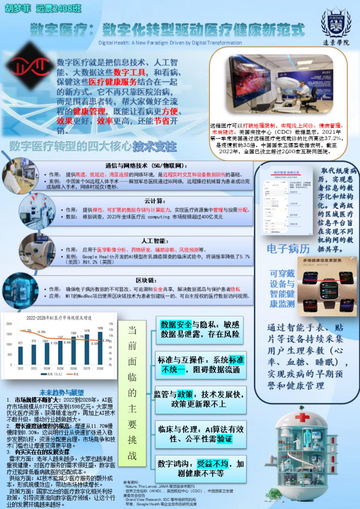 作品点评:作品以数字医疗为核心,精准锚定数字经济在民生领域的赋能逻辑:从通信网络、云计算等四大技术支柱的拆解,到远程医疗、电子病历等场景的落地案例,再到数据安全、数字鸿沟等现实挑战的梳理,既用数据强化实证性,也通过未来趋势预判展现行业视野。作品将数字技术的工具属性与医疗资源优化的现实需求结合,逻辑闭环、内容详实,整体是一份兼具专业性与民生温度的优质作业。