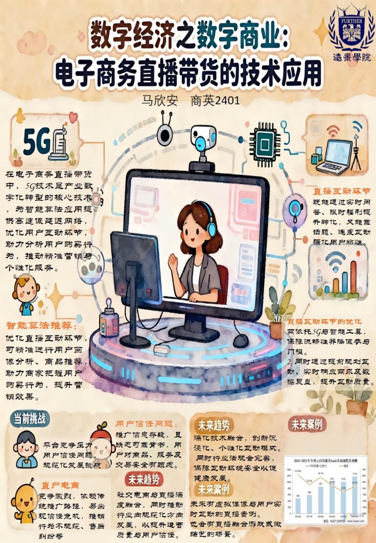 作品点评:作品聚焦电商直播带货领域,精准把握 5G 技术与智能算法的核心赋能作用,清晰拆解技术对用户互动、精准营销的优化路径。同时直面平台竞争、用户信任等行业痛点,提出技术融合与规范化发展的解决方案,还结合 SaaS 市场规模数据增强说服力。逻辑上从技术到应用、从问题到趋势层层递进,对数字商业的落地场景与发展困境有深刻洞察,整体展现了较强的行业观察与逻辑梳理能力。
