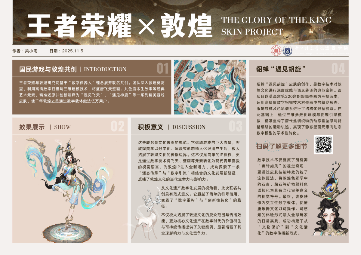 作品点评:作品以 “王者荣耀×敦煌” 联名案例切入,精准抓住数字经济中“文化数字化”的核心逻辑:从技术层(高精度扫描、三维建模)拆解数字工具对敦煌艺术的复刻,再到传播层(游戏载体触达亿级用户)分析文化破圈的路径,最后提炼“数字重构+创新转化”的价值,既讲清技术赋能的实操方法,也点明文化 IP 在数字时代的价值再生。整体是一份兼具行业洞察与文化深度的优秀作品。