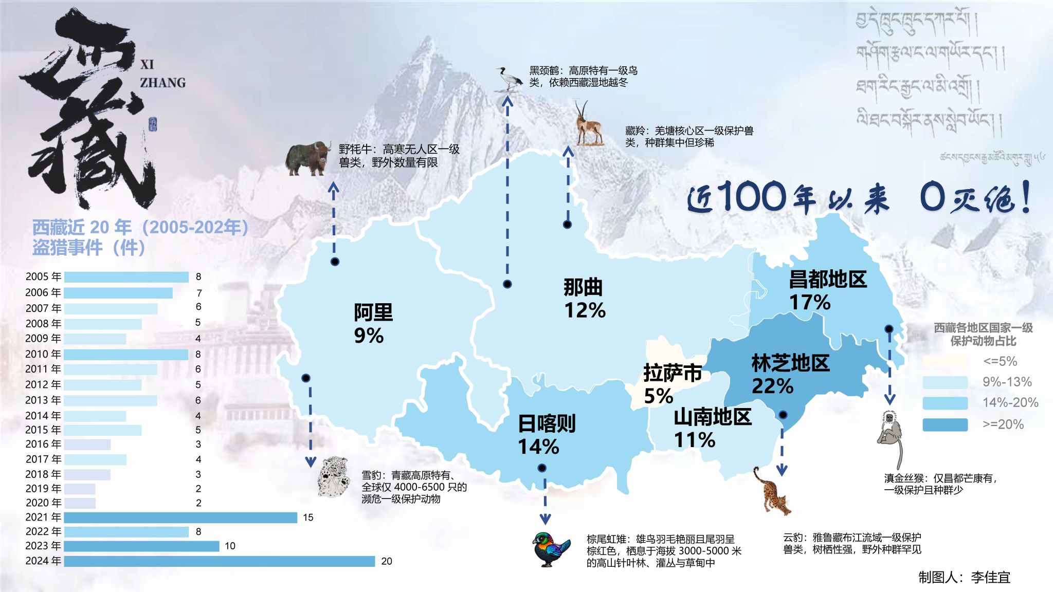 这幅作品以西藏生态危机为议题,通过冷峻的色调的设计语言,构建出强烈的视觉冲击力与情感张力。地图主体采用灰蓝色调隐喻雪山脆弱环境与冰川消融危机,不同深度蓝色斑块标示国家一级动物占比,形成渐变对比;濒危动物剪影暗示物种消逝的不可逆性。创作者巧妙融入时间轴图示,梳理盗猎活动,并引用具体数据盗猎事件增强说服力。强化了“生态保护与信仰传承”的深层主题。这是一幅兼具警示意义与人文关怀的环保地图,成功唤起观众对高原生态的紧迫关注。