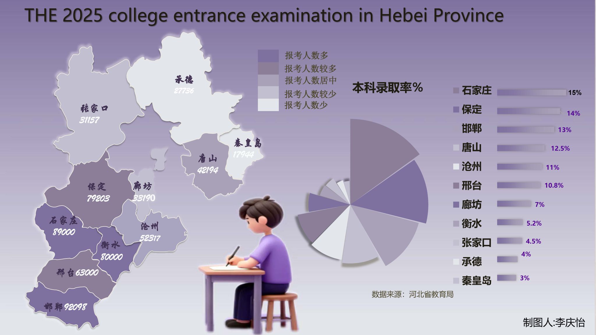 这幅作品以2025年河北省高考报考人数为棱镜,通过精密的数据可视化与地理空间映射,撕开了中国教育生态中最为尖锐的裂痕——考试竞争的残酷性与教育资源分配的失衡性。创作者未止步于呈现报考人数的密度差异,而是以地图为载体,将石家庄、保定等城市密集的紫色热力区,与张家口、承德等边缘地区稀疏的冷色调形成强烈对比,让“千军万马过独木桥”的抽象叙事,具象化为一场发生在燕赵大地上的教育生存战。