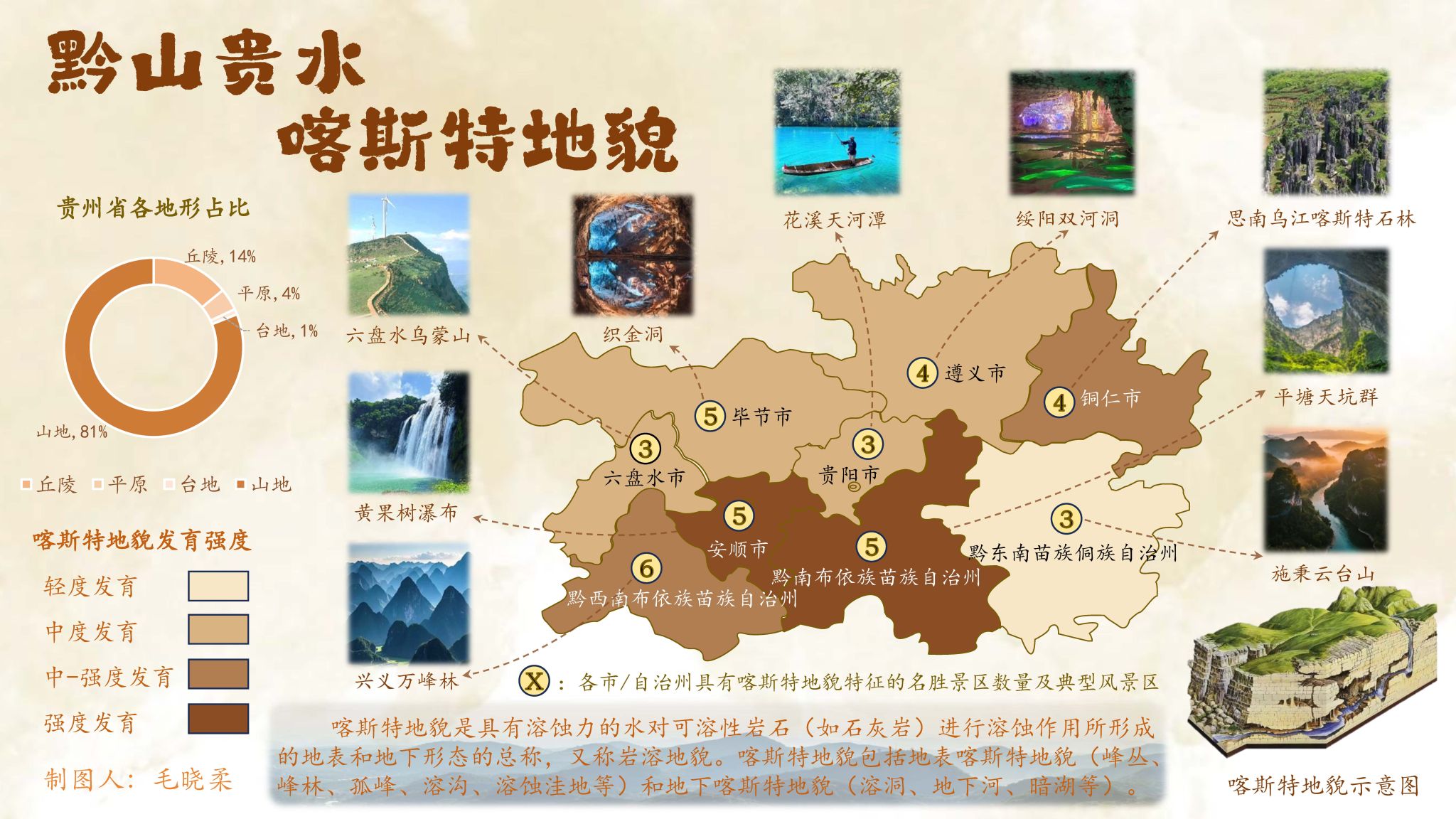 这幅作品以贵州喀斯特地貌为核心主题,通过精妙的视觉语言展现了这一独特地质景观的壮丽与神秘。创作者巧妙运用分层设色技法,以黄棕色色系为主调,模拟山峦叠嶂的立体感,同时通过字体与景区图片结合突出溶洞、峰林等典型地貌的细节。整体而言,这是一幅兼具审美价值与教育意义的地图佳作,展现了创作者对贵州自然遗产的深刻理解与可视化创新。
