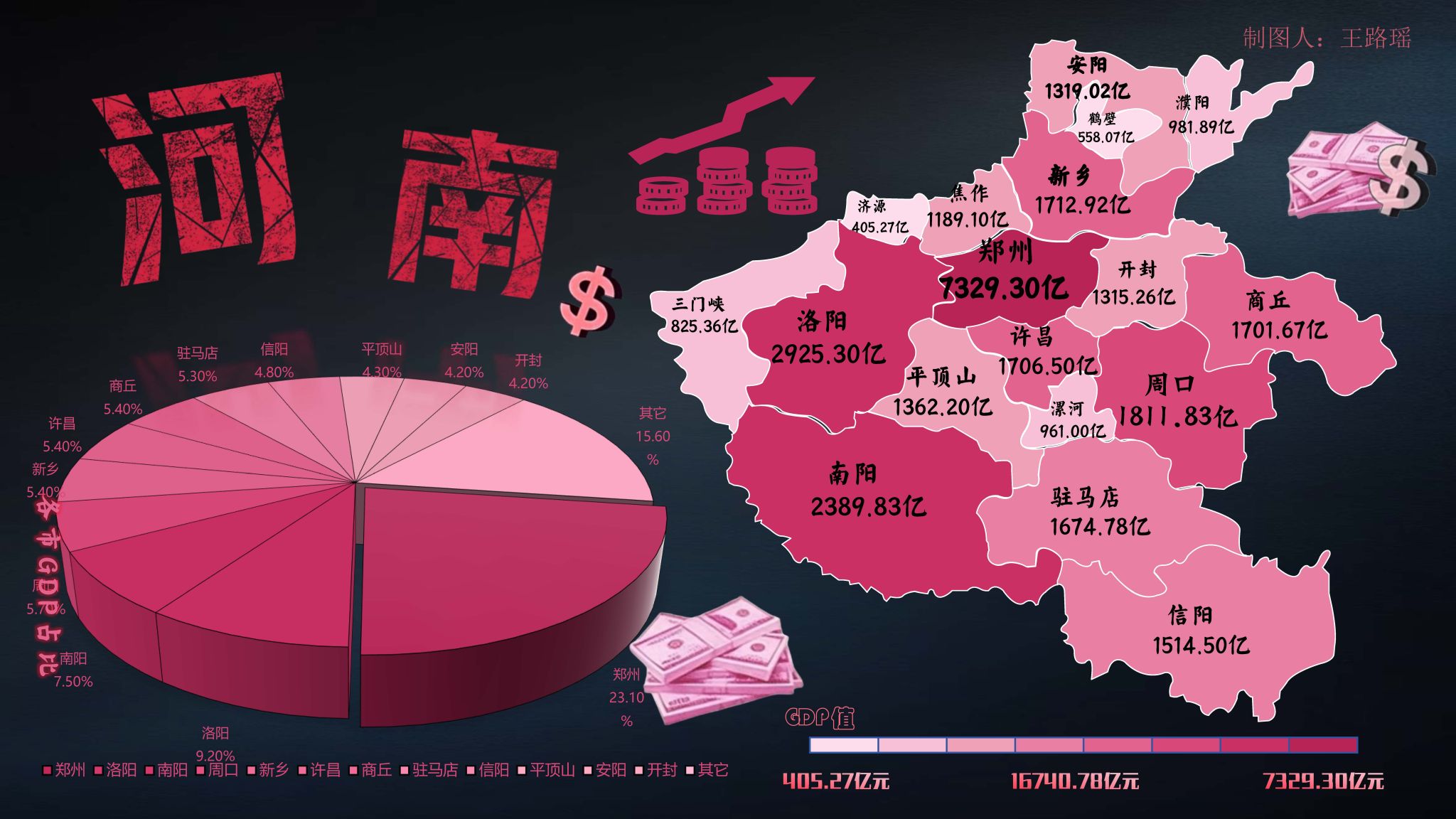 这幅作品以简洁明了的饼状图形式,直观呈现河南省内各城市GDP排名及增长趋势,是一幅典型的经济数据可视化地图。若能增加产业分布图层,或引入外部数据(如消费指数),可深化分析维度。此外,地图标题下方的金钱卡通形象,赋予作品趣味性和可读性。整体而言,这是一幅功能导向明确、数据呈现精准的经济地图,适合政策研究与投资参考。