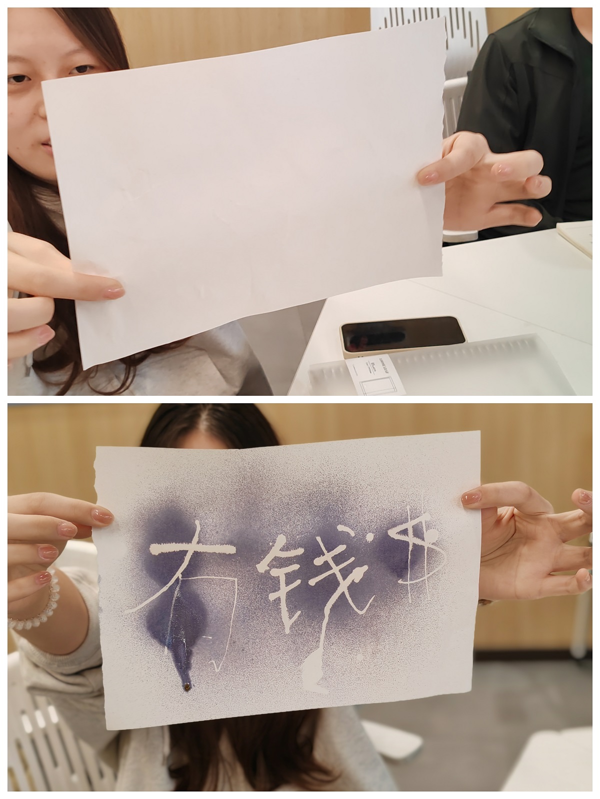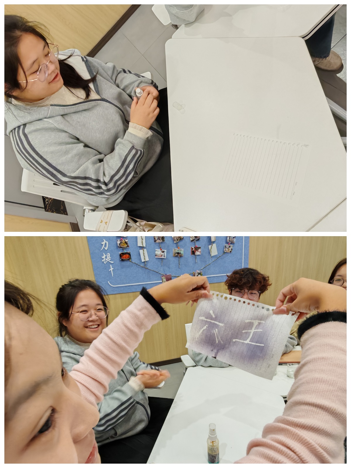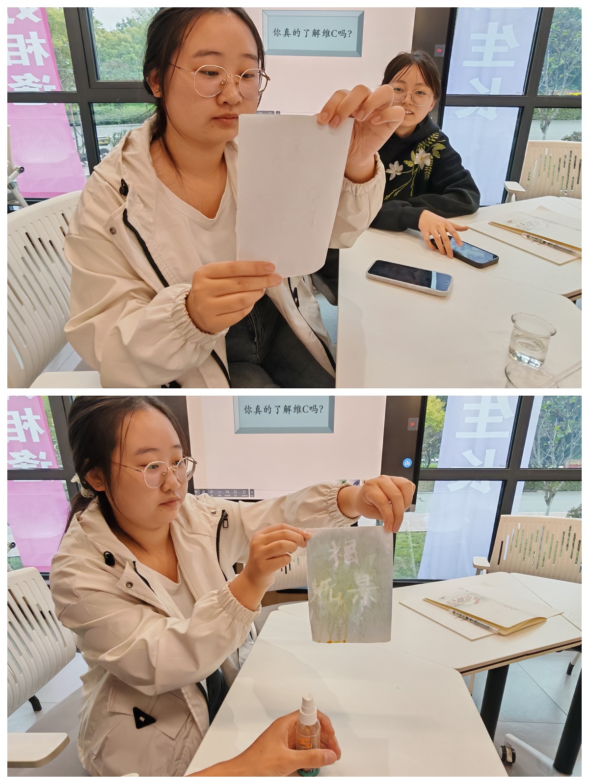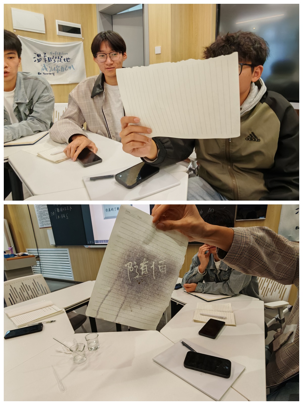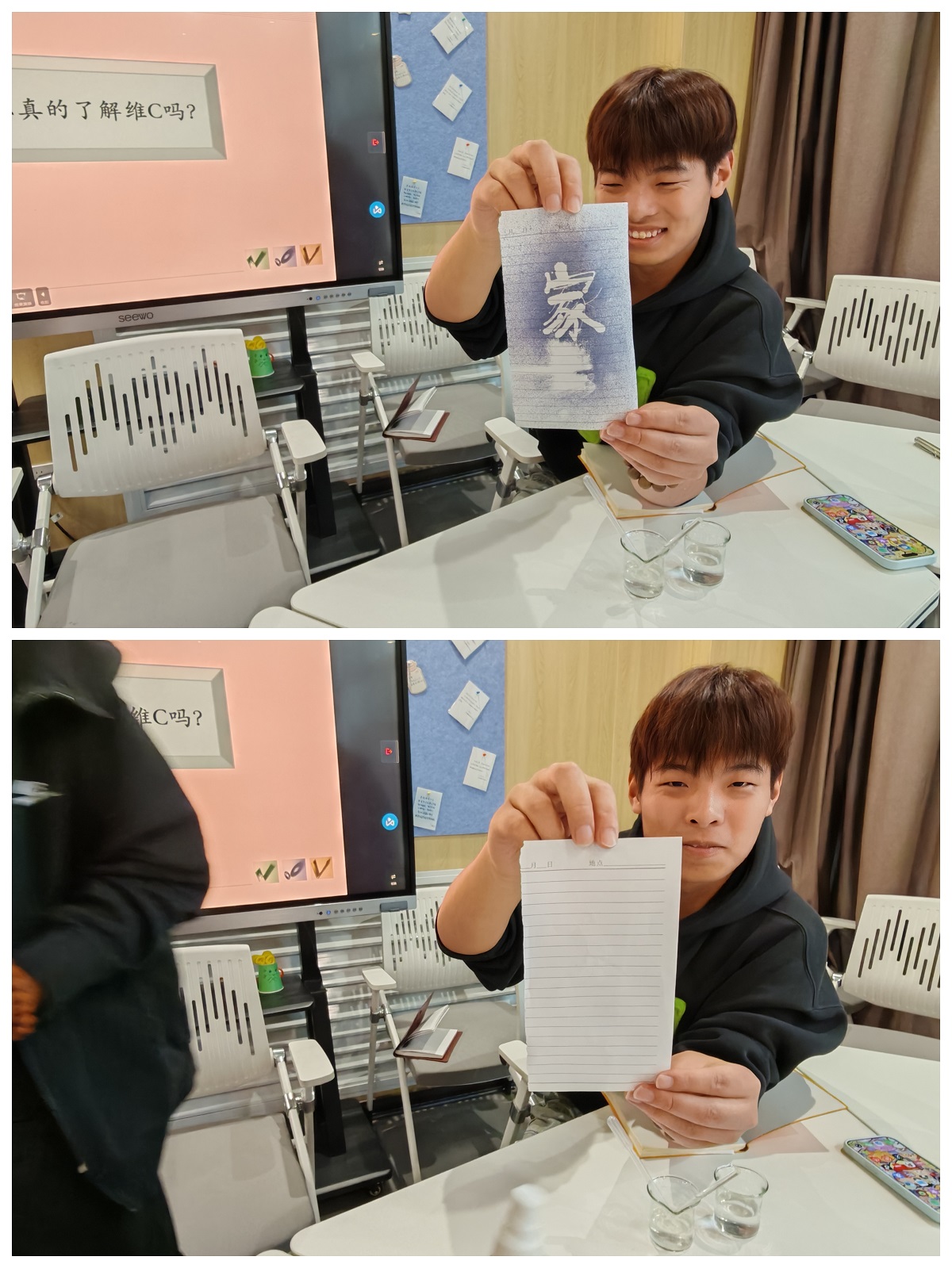 随后李文波老师解释道,这种颜色变化正是维生素C还原性的体现。在反应过程中,维生素C将碘单质还原为无色的碘离子,所以溶液变成了无色透明。在维生素C与碘液反应原理的启示下,同学们展现出了强烈的知识迁移能力和实验探索精神,又进行了实验的再创造——“维C密信”。