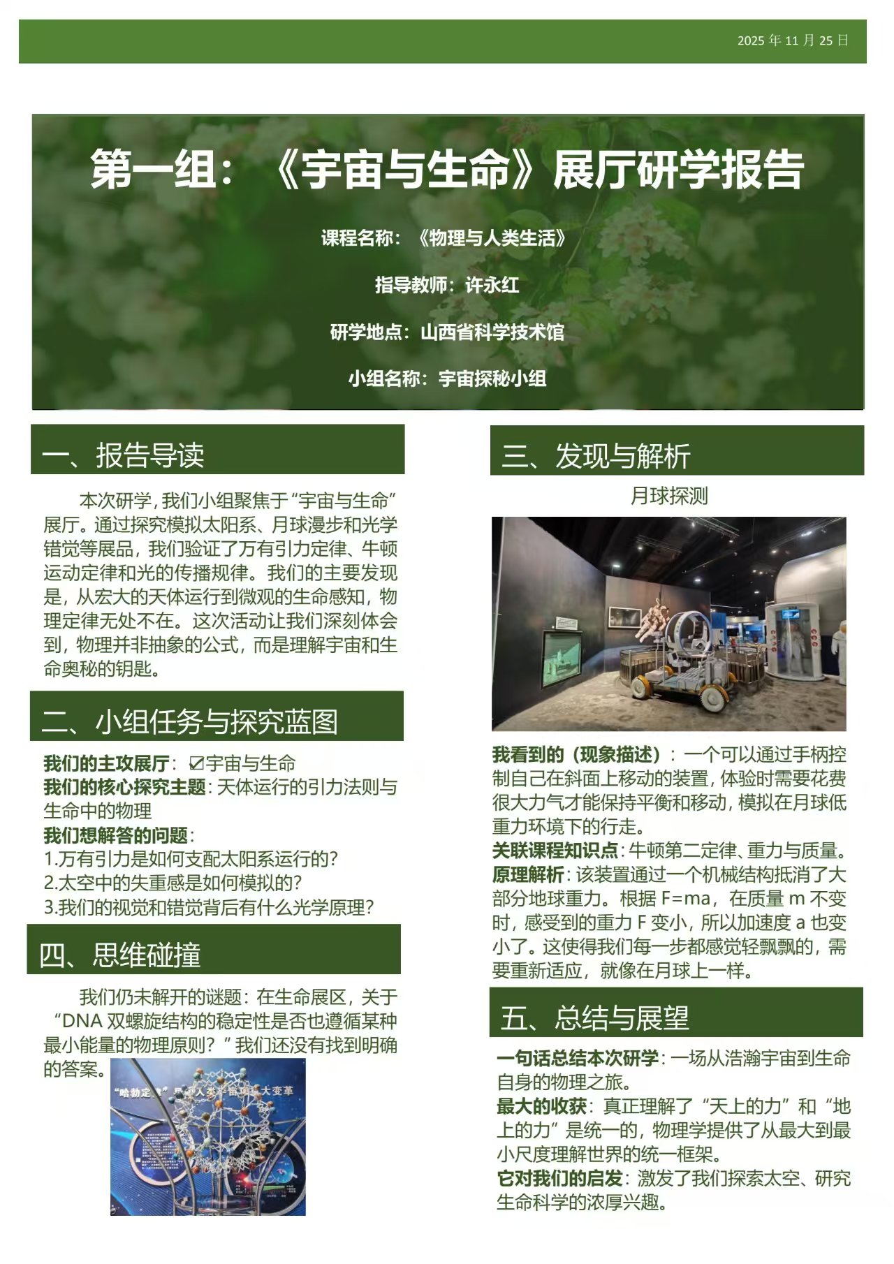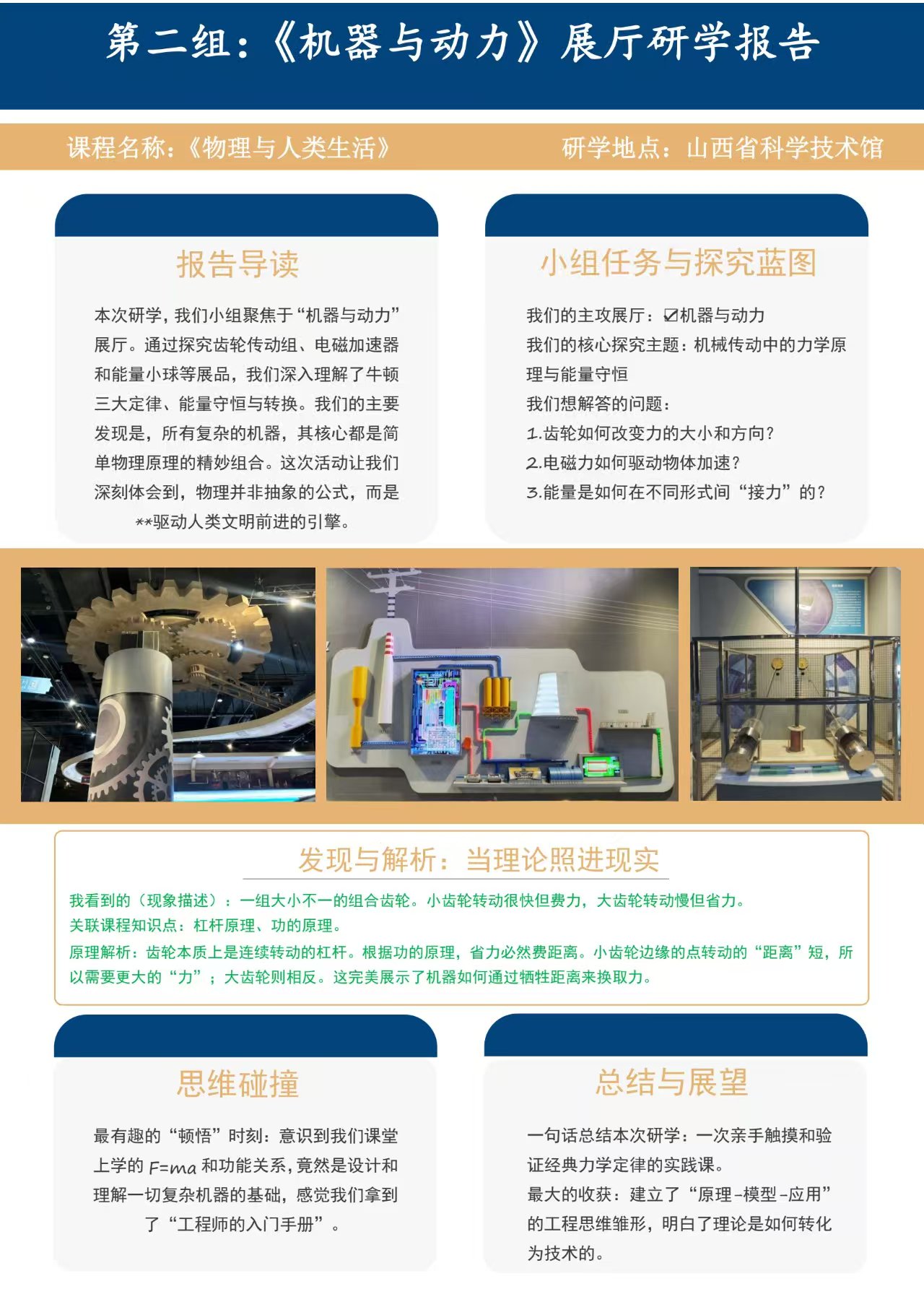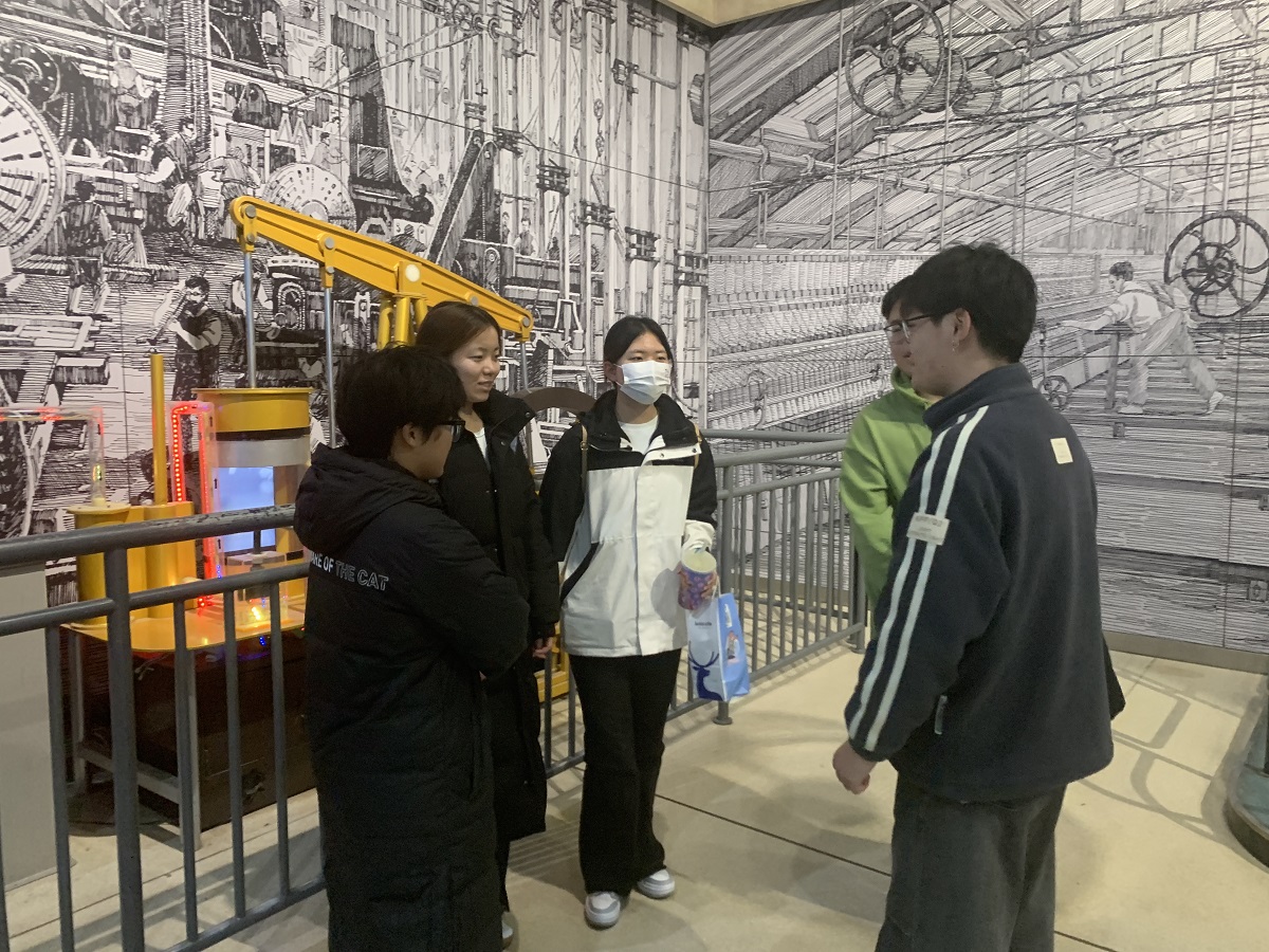 活动伊始,课程教师许永红明确了本次研学的目标与任务,将学生分为三个小组,分别聚焦于“宇宙与生命”“机器与动力”“走向未来”三大物理主题展厅。同学们沿着展厅的叙事脉络,在丰富的模型、互动装置与多媒体展示前驻足观察,从宏观宇宙到微观生命,从传统机械到未来能源,物理学的原理与应用无处不在。在“宇宙与生命”展厅,同学们凝视星图,模拟天体运行;在“机器与动力”展厅,他们操作机械模型,感受能量转换;在“走向未来”展厅,他们探讨碳循环与太空探索的前沿议题。每一件展品都成为理解物理概念、连接理论与现实的生动媒介。