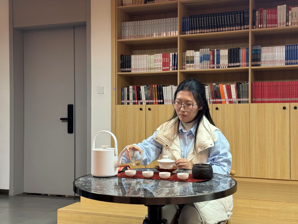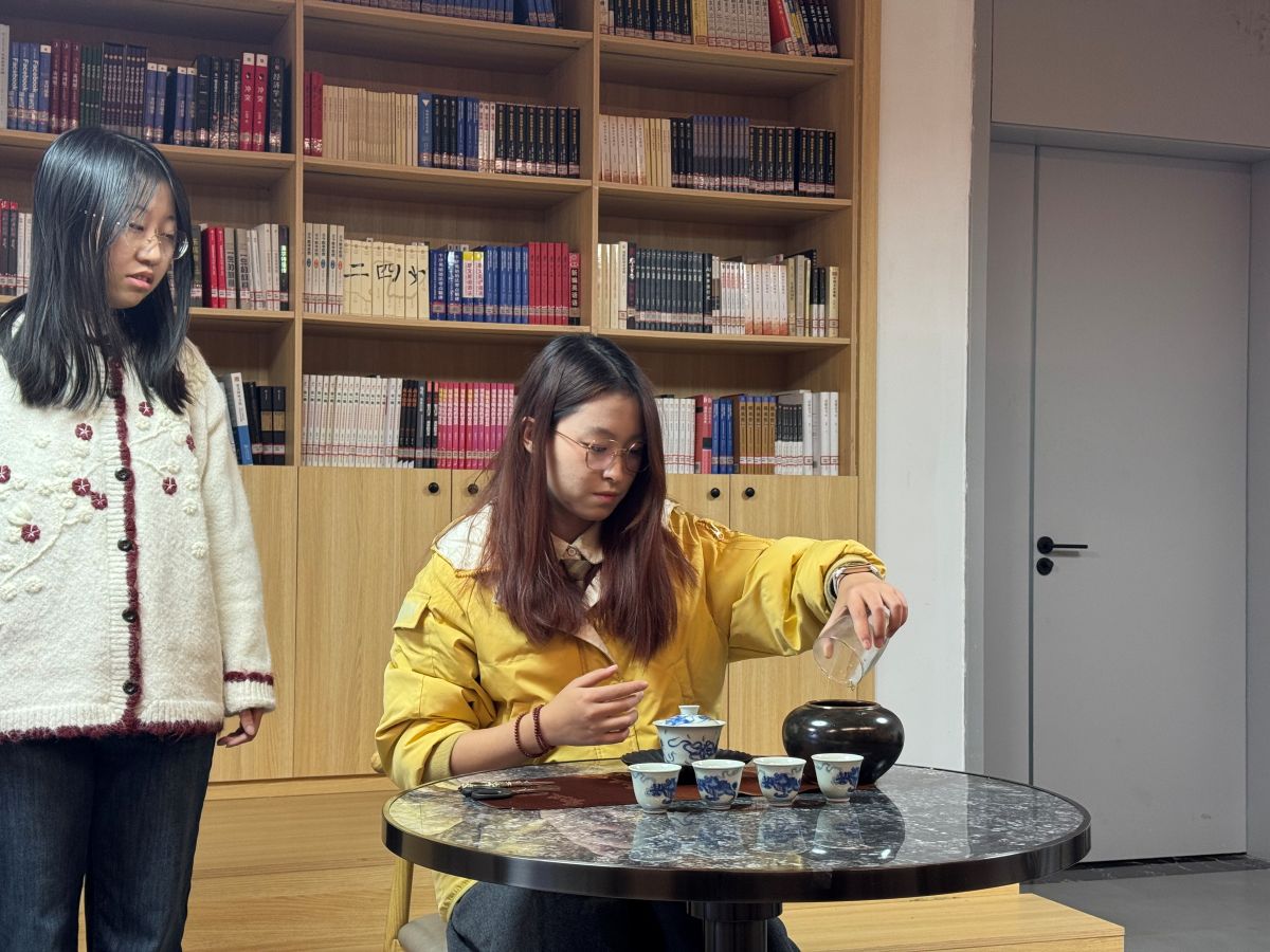“泡茶三要素”在今日课堂获得了最生动的注解。水温高低关乎茶叶绽放的韵律,投茶多少决定滋味平衡的智慧,出汤快慢则考验心手相应的功夫。学生们以青春之专注对话千年茶道,指尖所及,皆是学问。吴晛莉老师的目光如镜,映照出每个细微的仪节——她看见的不仅是技术的娴熟,更是礼仪精神在年轻生命中的萌发。