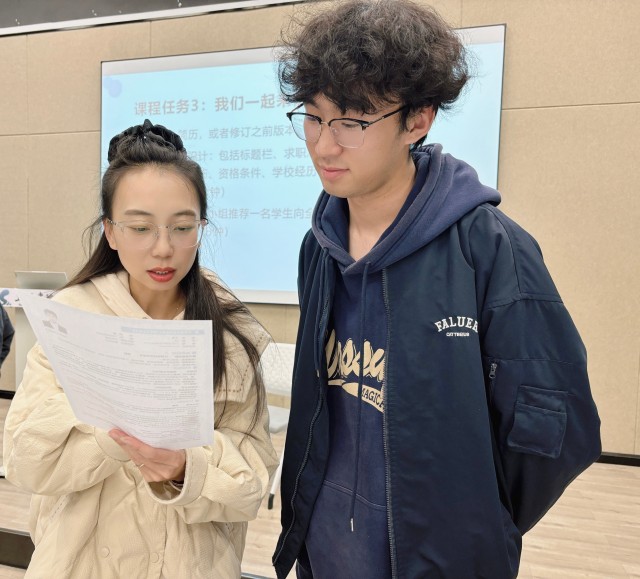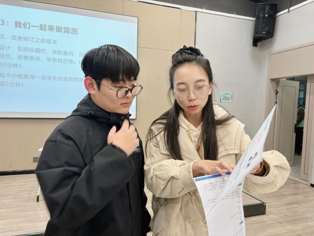 “这份简历的问题在于内容过于笼统,没有具体的事例支撑。我们要学会用具体的数据和案例来证明自己的能力。”张璐老师耐心地指出问题,并给出改进建议。学生们认真记录,不时点头表示理解,在温暖的氛围中不断提升着自己的求职能力。