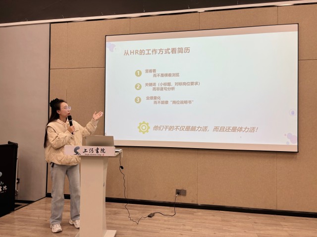 “简历就像我们的个人名片,一定要简洁而有重点。关键词就像是名片上的闪光点,能够让招聘者一眼就看到我们的优势。而成果量化则是用事实说话,证明我们的能力。”张璐老师用生动的比喻让学生们更容易理解这些抽象的原则。学生们认真聆听,不时点头回应,仿佛在这温暖的讲解中找到了求职的方向。