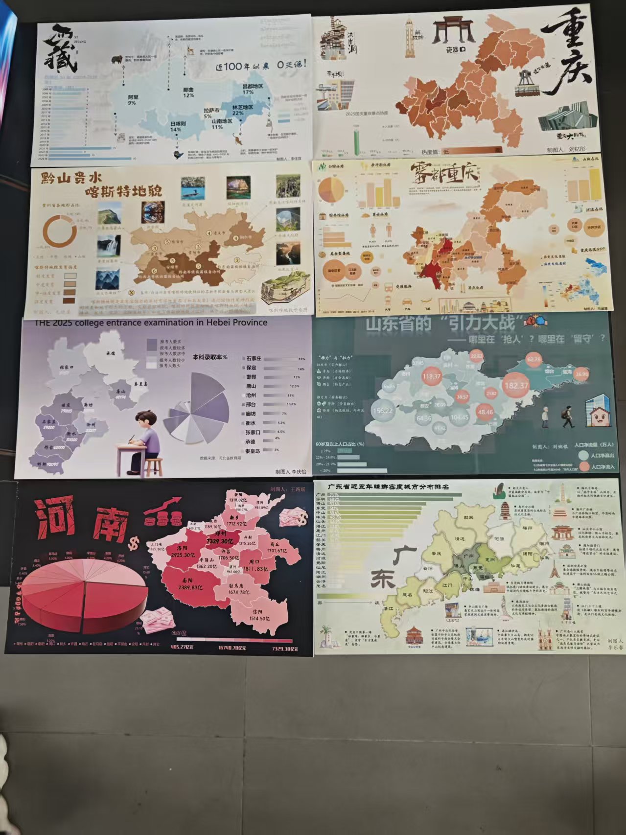 活动实施中,段老师独创"三阶批改法":初稿提交后,他与学生进行一对一面对面修改。通过"提问-引导-共创"的互动模式,帮助学生厘清逻辑漏洞、优化视觉表达、深化主题思考。例如,一名学生在初稿中将"山西古建的空间分布"简单标注一些建筑的年代,段老师通过追问:“数据来源是否可靠,可否增加一些其他的数据?建筑的高度,建筑的材质,建筑的风格等等?黑神话悟空爆火后如何通过政府规划缓解旅游压力?”通过问答式的方式引导学生完善作品,最终形成一幅富有趣味且蕴含数据支撑的专题地图。实践证明,修改过程比结果更珍贵。段老师展示的对比图显示,某学生作品从最初仅在空间上标注旅游景点,到最终增加风向玫瑰图、饼状图、雷达图、堆积柱状图,实现了从“现象描述”到“问题解决”的思维跃迁。这种深度参与式学习,使学生对“地图的空间语言表达”的课程核心概念有了具象化理解。
