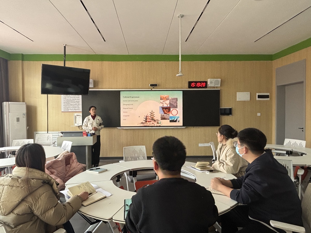 在通识课程建设专题活动中,赵晨倩副教授以《晋文化英语讲》为例,系统梳理了课程从无到有的建设脉络,坦诚分享课程迭代中的挑战与突破,详解内容体系的构建逻辑、教学方法的演进路径以及考核方式的多元设计,为通识类英语课程建设提供了可借鉴的范本。围绕双师授课模式,郝崇伶老师以中外教师合作讲授《大学英语3》为例,深入解读了双师协同的教学设计。该设计不仅注重提升学生的语言输出能力,更有机融入跨文化观察、跨文化交际意识与批判性思维的培养,体现了语言教学与人文素养培育的深度融合。